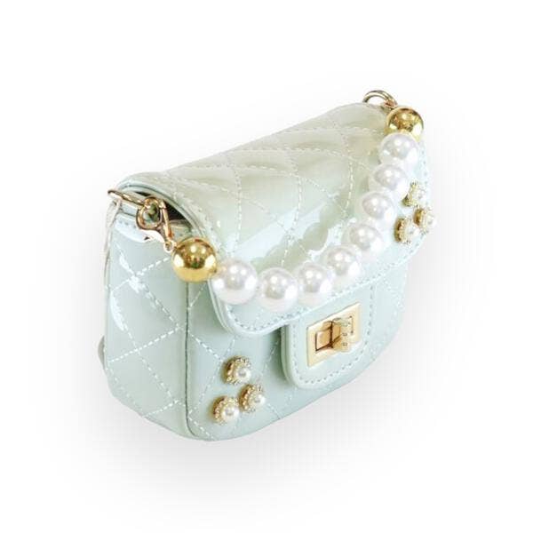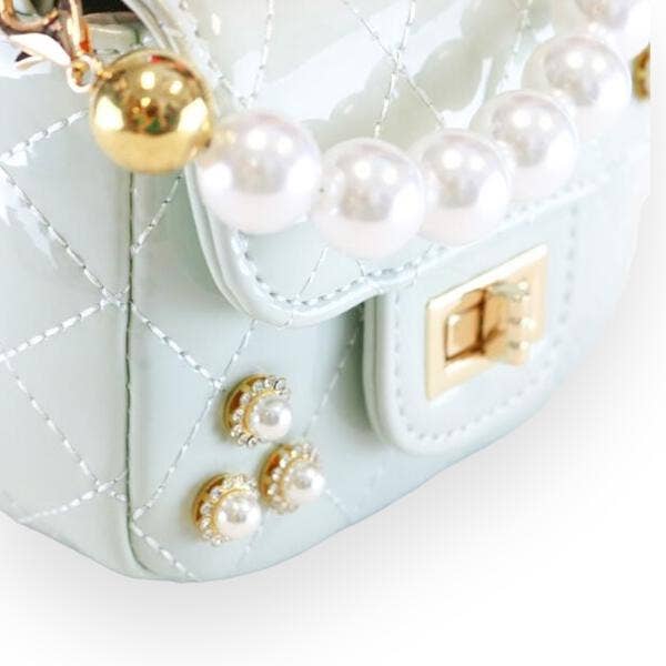 This gorgeous patent quilted purse features a lovely pearl handle and pearl accents for touch of elegance!
