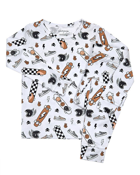 Meet the Sk8er Bamboo Two Piece Set —featuring playful skateboards, tiny sneakers, and bold graphic pops that bring street-style energy to every move. Crafted from a premium blend of 95% bamboo viscose and 5% spandex, it offers an ultra-soft, stretchy feel that will keep your little one comfortable all day long. Perfect for playtime, nap time, or family photos, this set brings both coziness and cuteness in one.