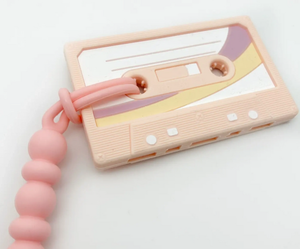 Give the coolest gift with this throwback to the 80's and 90's cassette tape teether and clip set! This teether offers multiple textures front and back to provide the best sensory surfaces for much needed teething relief. It is soft yet durable even for the most avid chewers. This design is so fun for both parents and babies! Made from 100% food grade silicone and free from harmful chemicals, this all silicone and plastic clip is a safer alternative to beaded clips.