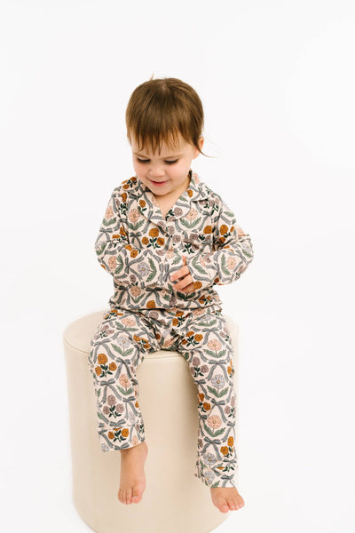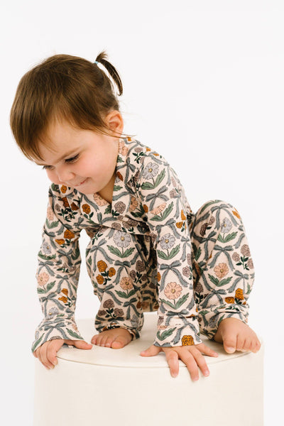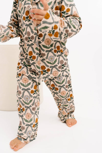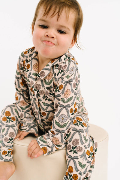 Our Cottage Bow Bamboo Button Up Set is an adorable addition to your child's wardrobe. This top and pant set, thoughtfully designed for modern appeal and maximum comfort, is not just an outfit, but an experience. Made of super soft bamboo in a subtly sweet blue cottage bow print, your little one will love lounge time and bedtime in this perfectly feminine set!