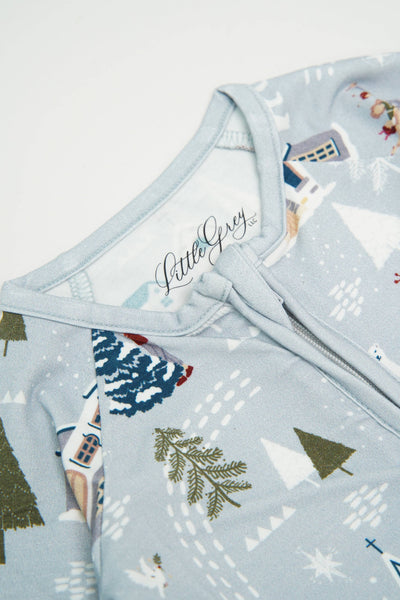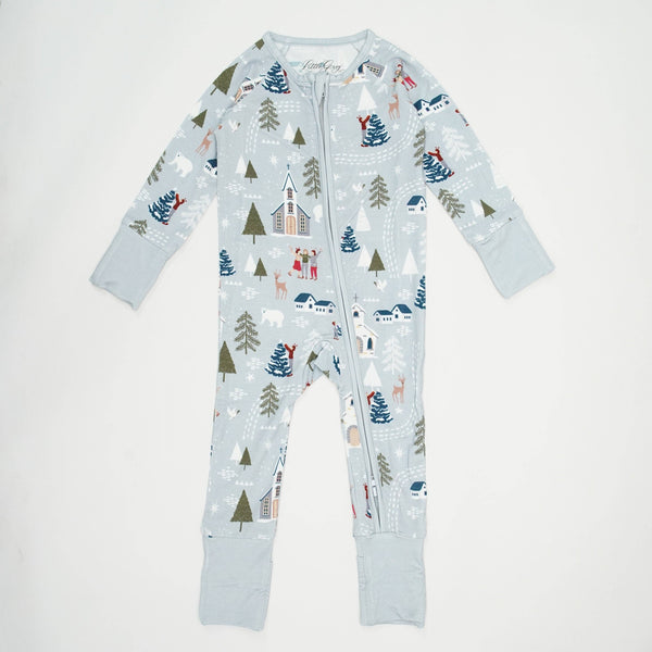 You are going to fall in love with this beautiful wintery scene and the softest bamboo romper for your little one! This sweet holiday print features: 2 way zipper, fold-over mittens and foot cuffs, and breathable and soft fabric. Material: 95% Bamboo Viscose 5% Spandex.
