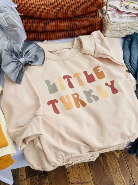 Get your little boy or girl ready for the season in our unisex Little Turkey Sweatshirt Romper! Perfect for Thanksgiving, this romper features a roomy fit for full tummies and snaps for easy diaper changes. Add leggings or knee high socks for a complete and adorable look. Gobble up this must-have now! (No turkeys were harmed in the making of this romper.)