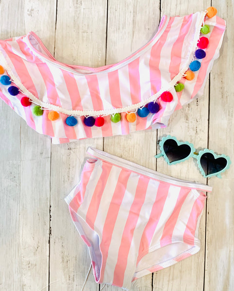 Watch her smile and come alive in this super fun 2-pc swim suit! Light pink and white striped body with tiny cutouts on the sides of the bottom and a ruffle pom-pom top that will make her move! Pair with any of our vibrant sunglasses and she will be vacation and weekend ready for all of her pool parties. Fit is true to size.